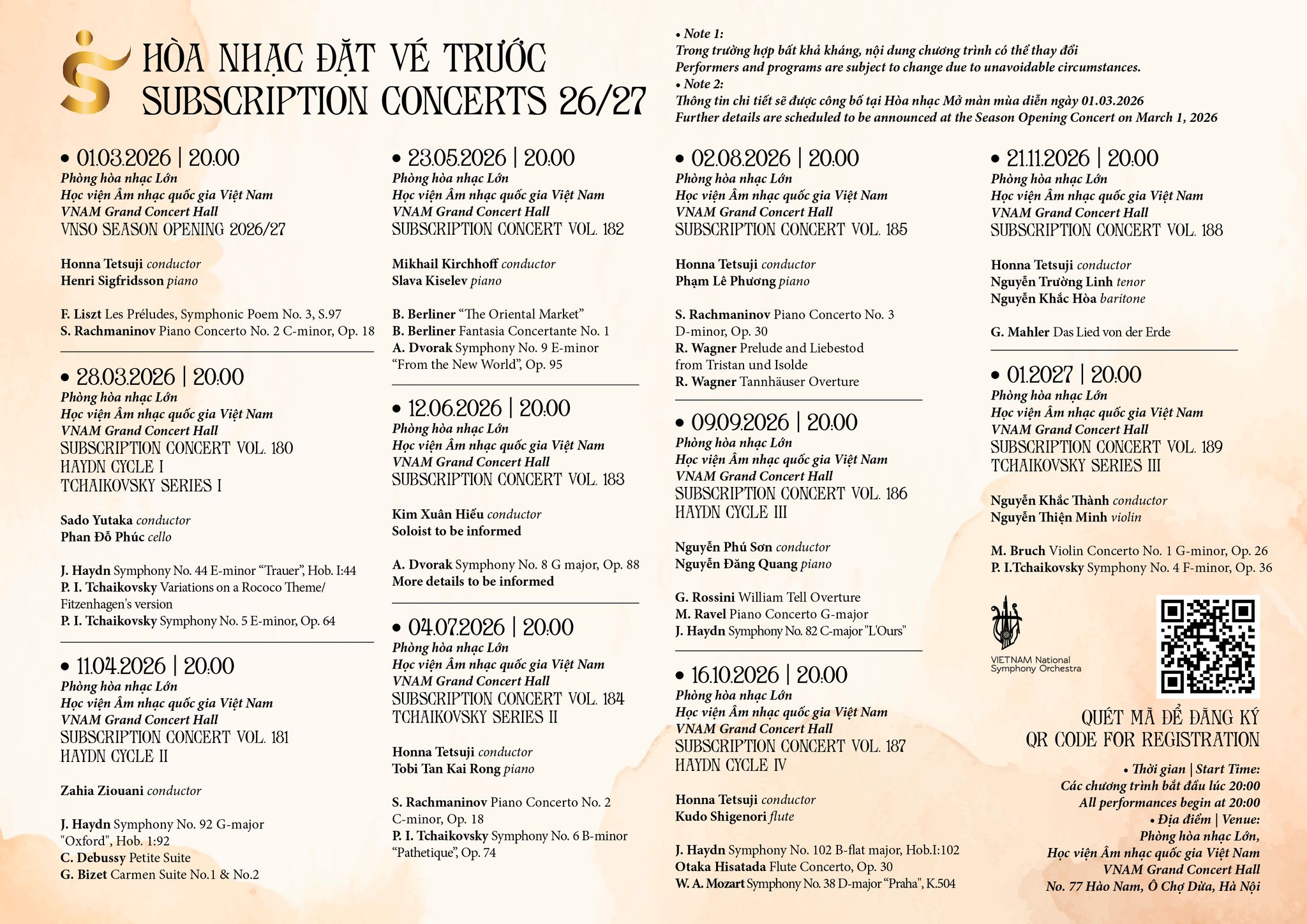 The Vietnam Symphony Orchestra (VNSO) is pleased to announce 10 Subscription Concert Series and a number of other programs in 2026, taking place at the Grand Concert Hall – Vietnam National Academy of Music.